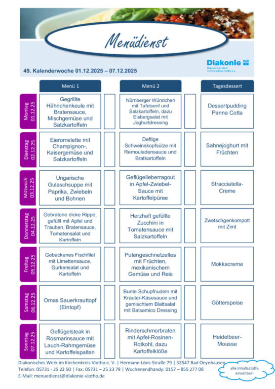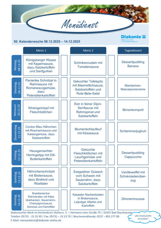 Leckere Menüs nach Wunsch genießen. An allen Tagen, auch an Wochenenden und den Feiertagen, liefert der Menüdienst der Diakonie eine große Auswahl geschmackvoller, frisch zubereiteter Menüs mit Dessert. Täglich bieten wir zwei Gerichte in folgenden Kostformen.