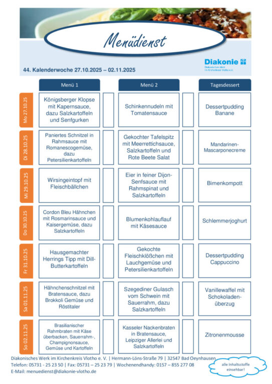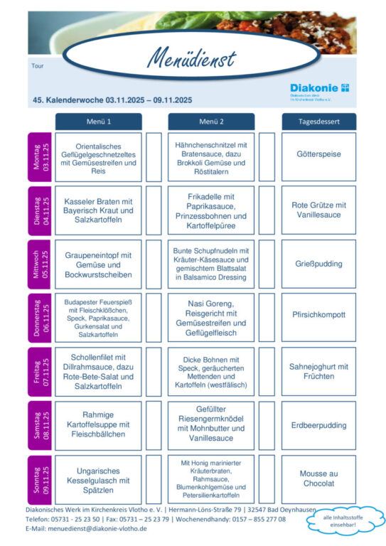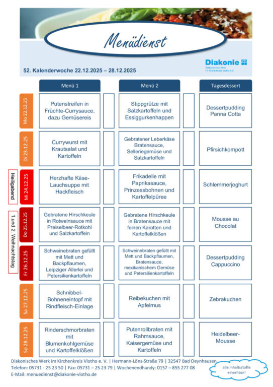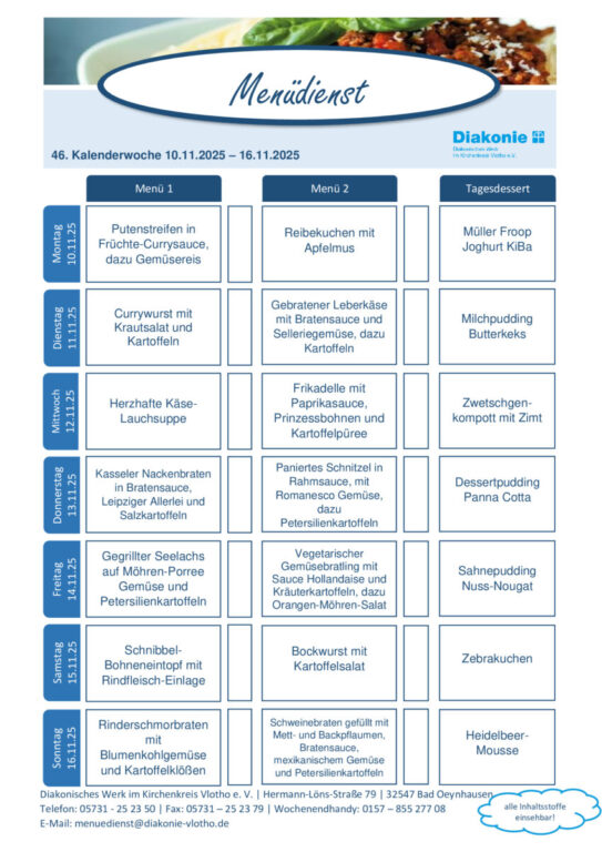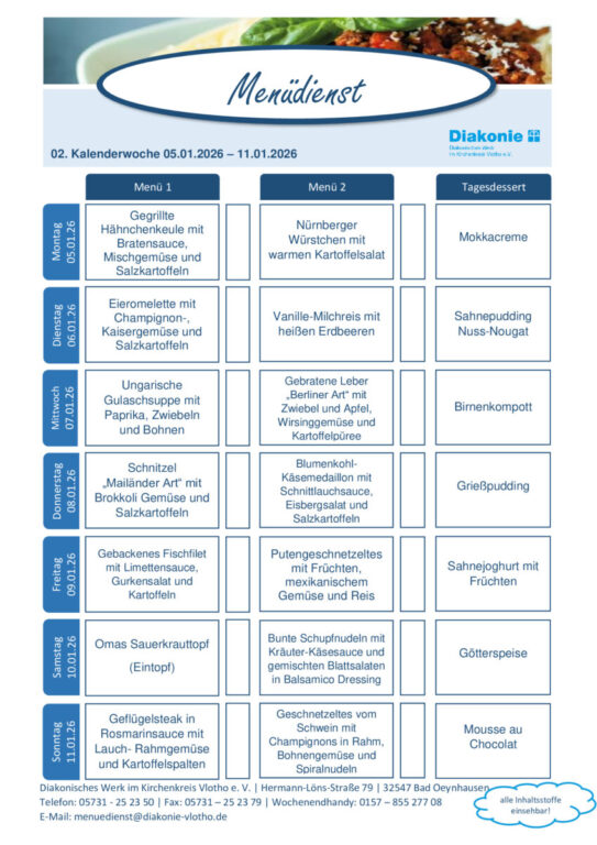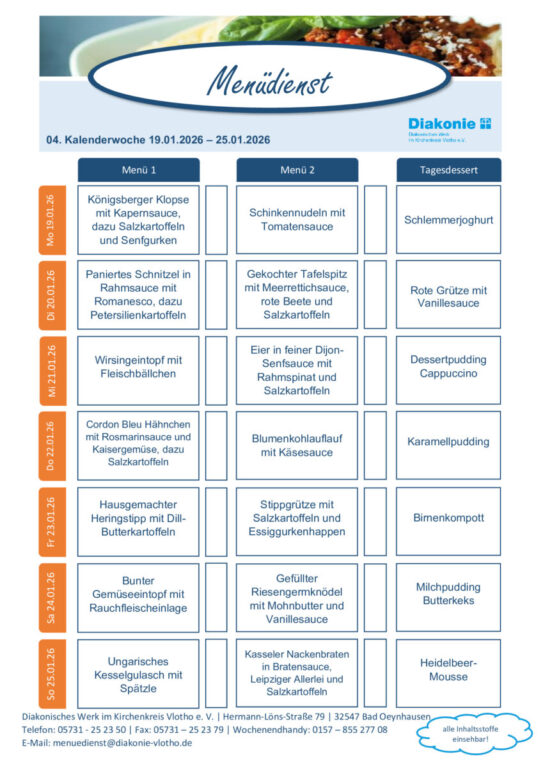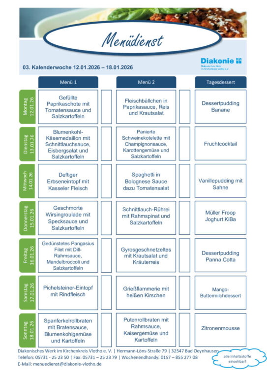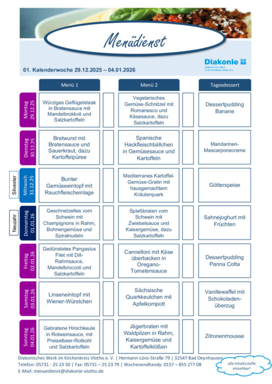Leckere Menüs nach Wunsch genießen. An allen Tagen, auch an Wochenenden und den Feiertagen, liefert der Menüdienst der Diakonie eine große Auswahl geschmackvoller, frisch zubereiteter Menüs mit Dessert. Täglich bieten wir zwei Gerichte in folgenden Kostformen.