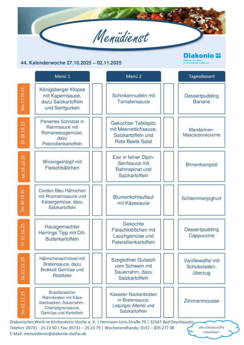 Menüplan Kalenderwoche 44, 27.10.-02.11.2025