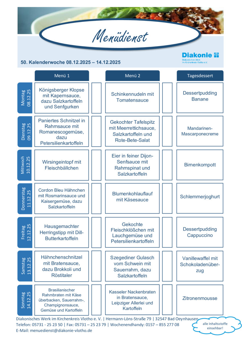 Menüplan Kalenderwoche 50, 08.12.-14.12.2025